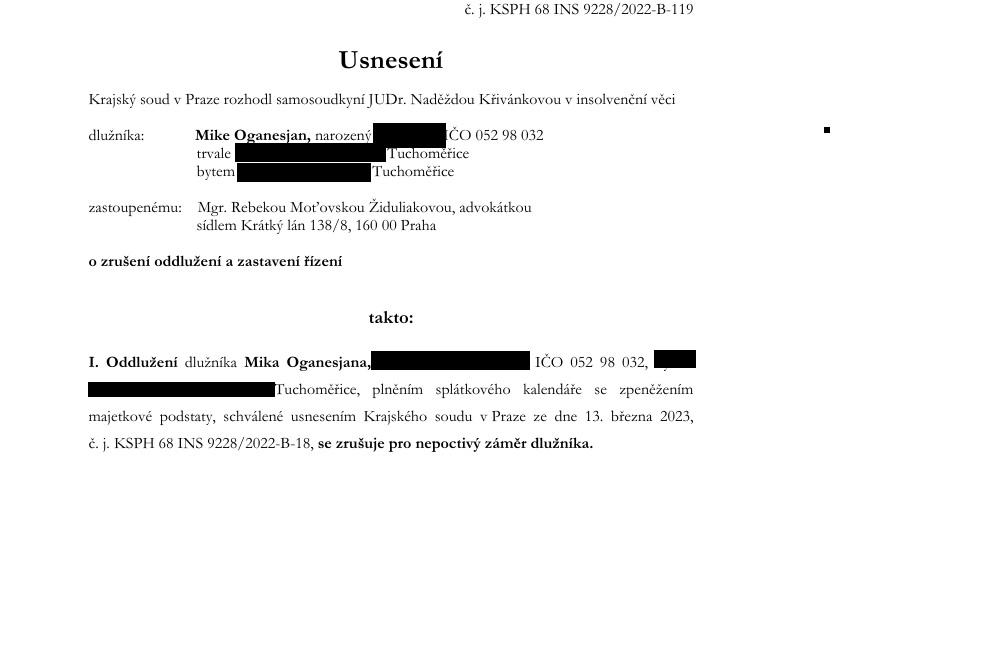 Základní právní fakt je neúprosný. Krajský soud v Praze rozhodl, že oddlužení Mikea Oganesjana se zrušuje pro nepoctivý záměr a insolvenční řízení se zastavuje. To není poznámka na okraj ani procesní detail. Je to mimořádně tvrdý závěr o tom, že dlužník v režimu osobního bankrotu nejednal způsobem, který insolvenční právo vyžaduje.