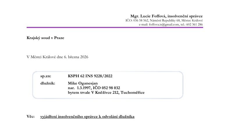 Zlom podle spisu nastal ve chvíli, kdy si insolvenční správkyně dodatečně vyžádala součinnost od Revolut Bank UAB. Ve svém vyjádření k odvolání výslovně uvedla, že tato banka poskytla transakční historii účtu dlužníka za období od 1. dubna 2023 do 5. března 2026, a současně připomněla, že dlužník opakovaně prohlašoval, že jiné bankovní účty nemá. Už tento rozpor je sám o sobě právně závažný. MO 1