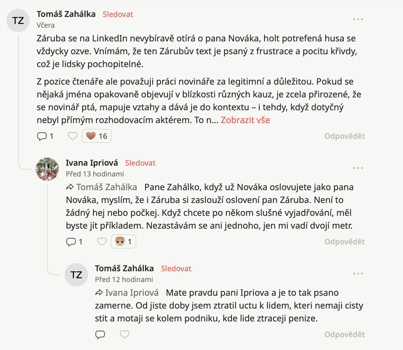 Záruba na konci navíc naznačuje, že komunikaci ukončuje a další dotazy si nepřeje. Tím celá věc získává typický „dramaturgický“ závěr: rána – obvinění – rozchod. Ať už byl jeho cíl jakýkoli, dopad je jasný: po zveřejnění podobných slov se z odborné polemiky stává sociální lynč v přímém přenosu, kde se už neřeší podstata článku, ale kdo koho veřejně ponížil.