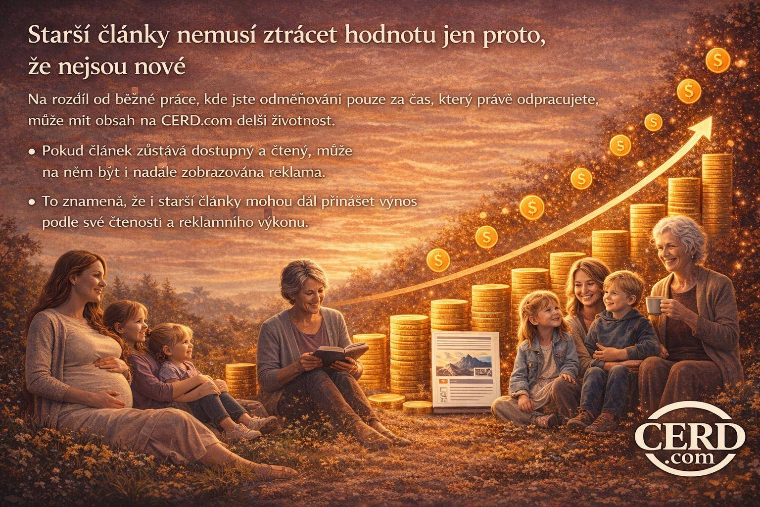 Na rozdíl od běžné práce, kde jste odměňováni hlavně za čas, který právě odpracujete, může mít obsah na CERD.com delší životnost. Pokud článek zůstává dostupný a čtený, může být stále zajímavý pro nové návštěvníky i pro reklamní prostor.