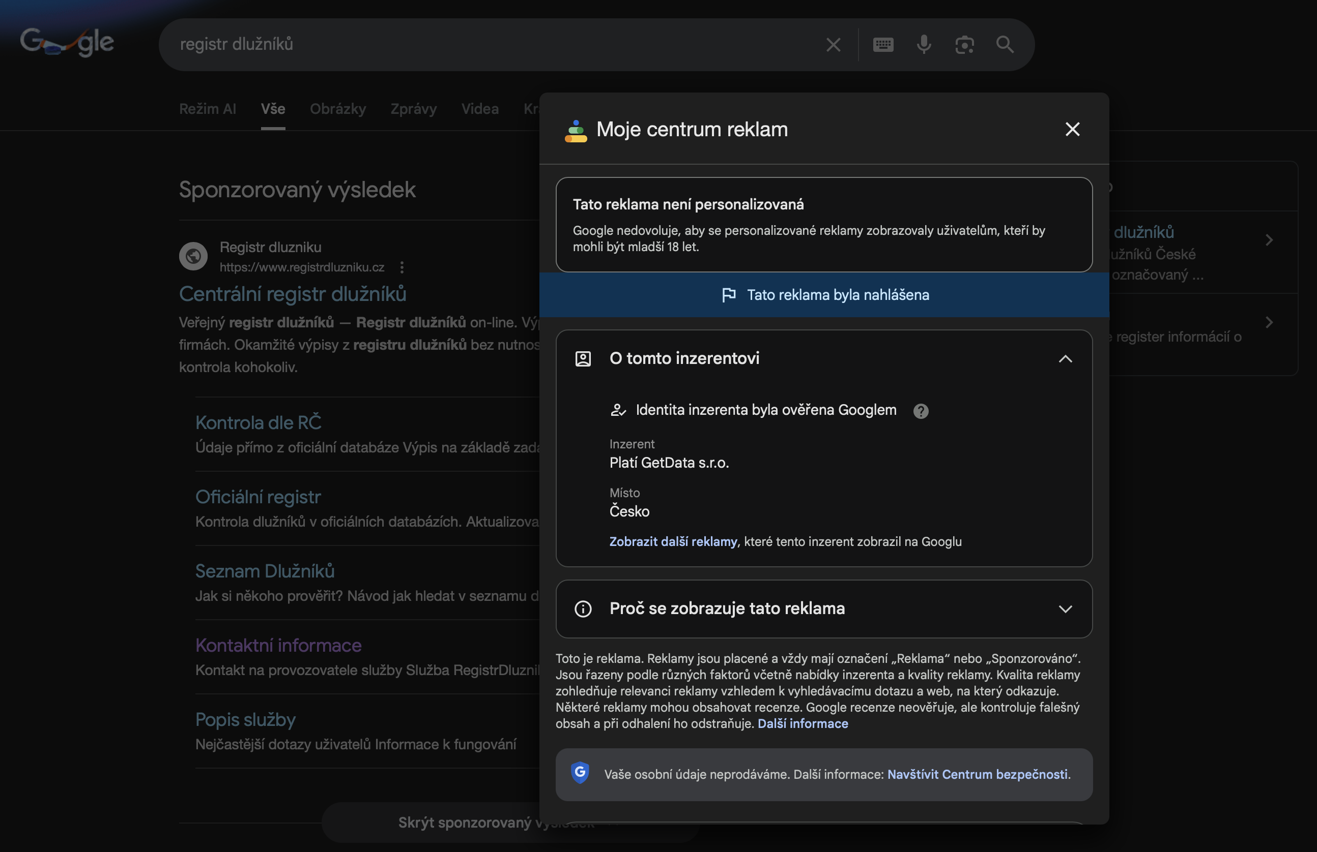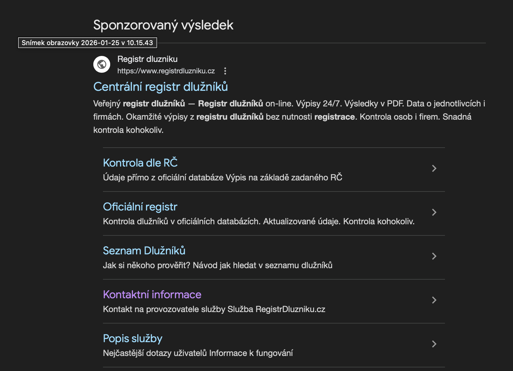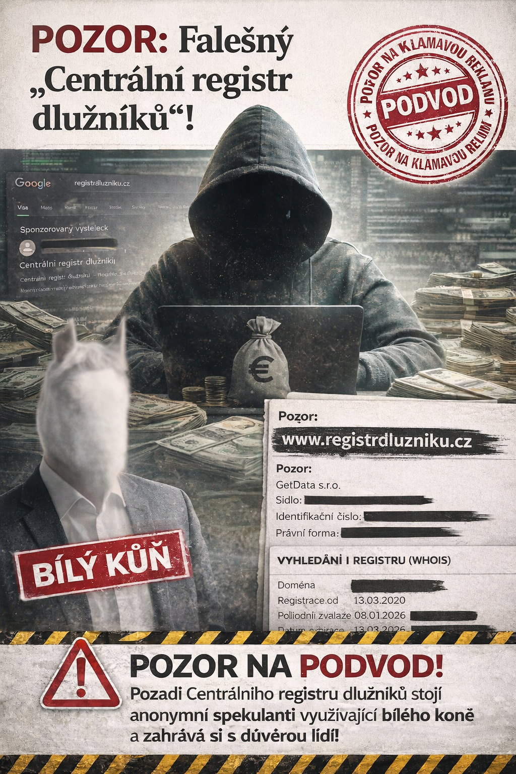 Na první pohled působí jako oficiální „Centrální registr dlužníků“. Ve skutečnosti však doména registrdluzniku.cz představuje komerční projekt, který se pomocí placené reklamy na Googlu dostává na přední pozice ve vyhledávání a může u uživatelů vyvolávat mylný dojem státní či centrální autority. Zjištěné vazby ukazují na účelové přesouvání odpovědnosti a využívání tzv. „bílého koně“.